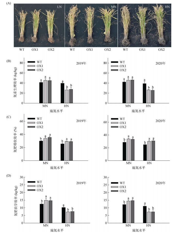 (图A为2019年试验季收获时OsAMT1;1过表达植株的代表性照片,Bar=1 dm) 图 4 OsAMT1;1过表达对水稻氮素利用效率的影响 Fig. 4 Effects of OsAMT1;1 overexpression on rice nitrogen use efficiency |