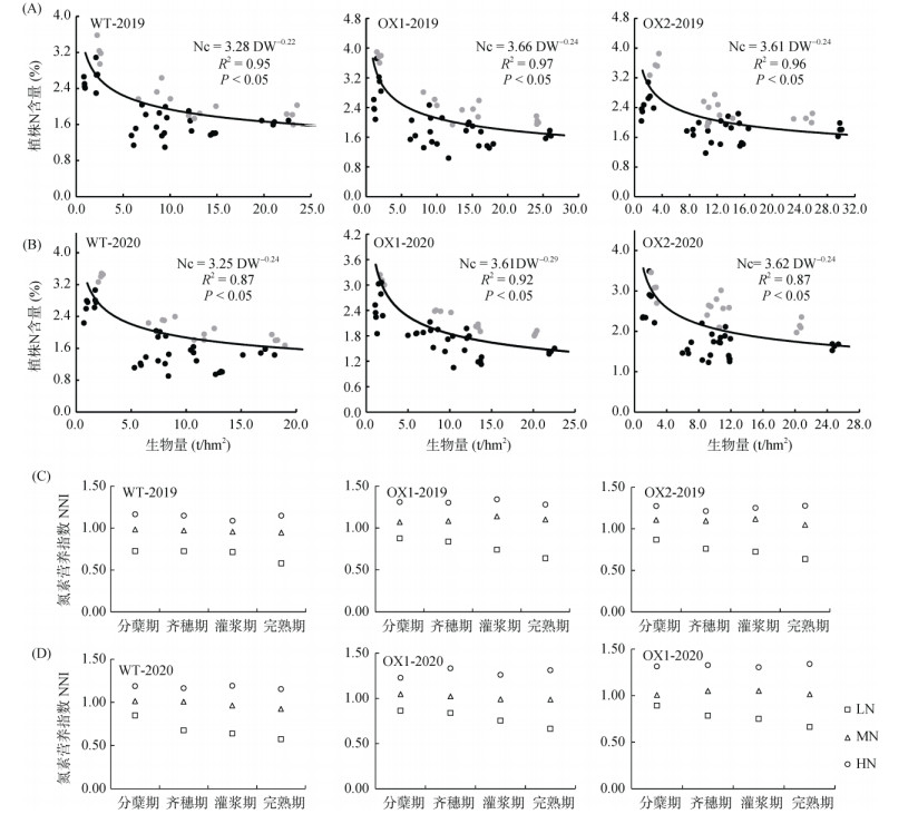 本研究分别对2019年和2020年稻季的WT、OX1和OX2株系建立了氮素稀释曲线(图 5A ~ 5B),推导出的a和b参数在不同水稻品系之间以及两个生长季节之间有所不同,但临界氮含量(Nc)与生物量(DM)的关系可以较好地通过Nc = a×DM -b (R2 =0.87 ~ 0.97)方程进行拟合,参数a和b的估计范围分别为3.25 ~ 3.66和0.22 ~ 0.29。OsAMT1;1过表达株系的a值比WT植株大,表明OsAMT1;1过表达植株的氮素含量在生长初期更具优势;b值相近,表明各株系在生育后期氮素含量的变化趋势较为稳定(图 5A ~ 5B)。通过对氮素营养指数(NNI)的分析发现,LN条件下各株系水稻的NNI值均明显小于1,表明植株的生长受到氮素缺乏的限制(图 5C ~ 5D);在MN条件下,OsAMT1;1过表达株系的NNI值大于WT(图 5C ~ 5D),表明OsAMT1;1过表达可能通过促进铵吸收能力提高了水稻植株的氮素获取能力,促进了氮素积累。尤其在灌浆期,WT的NNI理论值明显小于OsAMT1;1过表达株系,在0.96左右变化(图 5C ~ 5D),表明该施氮量适合WT的最佳生长,而过表达株系的NNI值在0.99 ~ 1.14之间变化,比WT的适应范围更高。在生育后期,过量施氮(HN)的情况下,WT植株的NNI值更接近临界值,而OsAMT1;1过表达株系表现出植株氮过量的趋势,NNI值远大于临界值,表明OsAMT1;1过表达在过量施氮时造成了植株体内氮素过剩。基于以上分析发现,OsAMT1;1过表达在适宜施氮植株氮素养分有限时促进氮的获取,有利于改善植株氮营养,提升植株的物质生产能力。