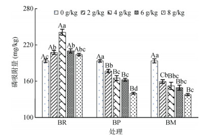 (BR:水稻秸秆生物质炭;BM:玉米秸秆生物质炭;BP:花生壳生物质炭。图中大写字母不同表示同一添加量不同生物质炭处理间差异达P < 0.05显著水平, 小写字母不同表示同一生物质炭处理不同添加量间差异达P < 0.05显著水平。下同) 图 1 不同来源生物质炭和添加量下土壤对磷的吸附量 Fig. 1 Phosphorus adsorption of brown soil under different types and amounts of biochars |