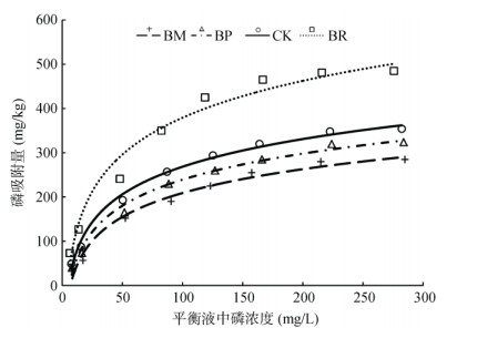 图 2 生物质炭对棕壤磷吸附等温线的影响 Fig. 2 Effects of biochars on soil phosphorus adsorption isotherm |