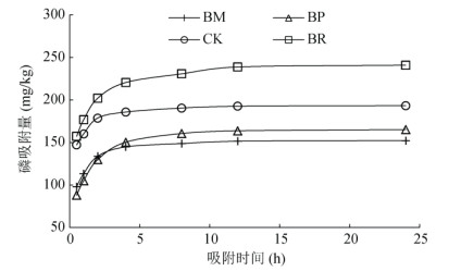 图 3 生物质炭对棕壤磷吸附动力学的影响 Fig. 3 Effects of biochars on phosphorus adsorption kinetics of brown soil |