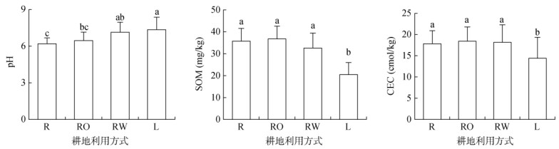 (图中小写字母不同表示差异显著(P < 0.05),下同) 图 1 不同耕地利用方式土壤pH、SOM与CEC含量 Fig. 1 Soil pH, SOM and CEC of farmlands under different use patterns |