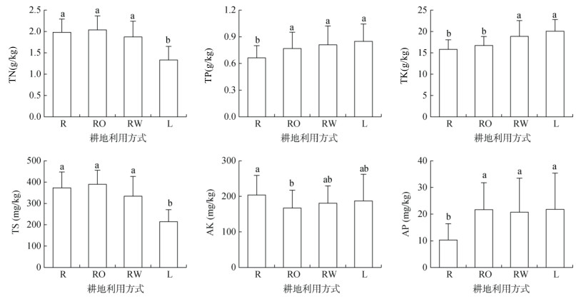 土壤TN、TP、TK、TS是土壤肥力的重要组成部分,是维持作物生长所需氮磷钾硫的养分库,是反映土壤肥力供应状况的重要指标。从图 2中可以看出,不同利用方式土壤TN与TS含量相似,油稻田 > 水稻田 > 麦稻田 > 旱地,均值分别为2.04、1.98、1.87、1.33 g/kg和389.46、372.96、333.94、214.45 mg/kg,水田土壤TN和TS含量明显高于旱地。不同利用方式土壤TP和TK含量相似,旱地 > 麦稻田 > 油稻田 > 水稻田,均值分别为0.85、0.81、0.77、0.66 g/kg和20.08、18.86、16.72、15.81 g/kg,旱地TP和TK含量高于水田。土壤有效态养分与作物生长有着密切的关系,对作物产量和品质有较大的影响。由图 2可知,土壤中AP含量大小依次为旱地 > 油稻田 > 麦稻田 > 水稻田,均值分别为21.81、21.71、20.74和10.33 mg/kg;总体来看,旱地AP含量高于水田。土壤AK含量大小依次为水稻田 > 旱地 > 麦稻田 > 油稻田,均值分别为203.81、187.1、180.89和167.21 mg/kg;总体来看,AK含量均值在旱地和水田中差异不显著。