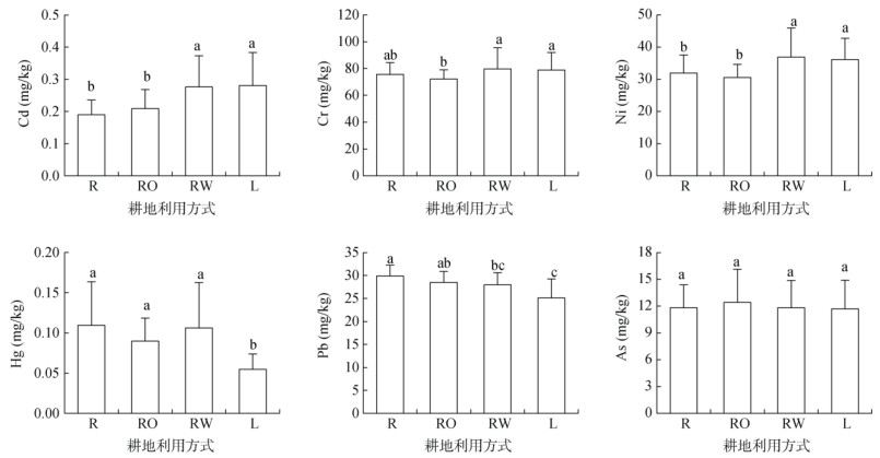 图 3 不同耕地利用方式土壤重金属含量 Fig. 3 Soil heavy mental contents of farmlands under different use patterns |