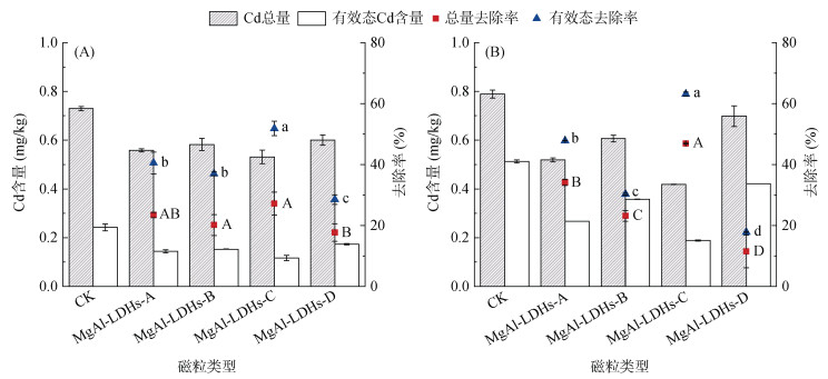(图中不同小写字母表示不同材料对有效态Cd的去除率存在显著差异(P < 0.05),不同大写字母表示不同材料对Cd总量去除率存在显著差异(P < 0.05)) 图 1 不同MgAl-LDHs磁性颗粒对甘肃白银灰钙土(A)和江苏太仓淹育型水稻土(B)Cd的去除效果 Fig. 1 Removal effects of different MgAl-LDHs magnetic particles on Cd in Sierozem from Baiyin City of Gansu Province (A) and flooded paddy soil from Taicang City of Jiangsu Province (B) |