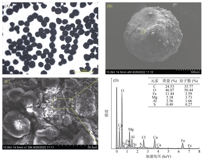 MgAl-LDHs-C的表面形貌如图 2所示。图 2A为磁粒MgAl-LDHs-C的激光共聚焦形貌,可见,其颗粒形状为椭球型球体,平均粒径为(1.4 ± 0.17) mm,密度为(1.80 ± 0.01) g/cm3。磁粒在振荡条件下能与土壤溶液充分接触,在外磁场作用下易于从土壤溶液中分离。图 2B为单个磁粒颗粒扫描电镜图,可以观察到MgAl-LDHs-C表面粗糙有凹坑及颗粒状凸起。物理吸附仪测试结果表明,MgAl-LDHs-C的比表面积为1.052 1 m2/g,总孔容积为6.50 mm3/g,平均孔径为24.78 nm,表明磁粒的表面具有丰富的褶皱与孔隙。这种孔隙结构有利于重金属离子进入材料的固液边界层,进而进入材料表面的微/介孔中,并与材料内部的活性位点结合,实现对重金属的去除[24]。通过扫描电镜局部图及能谱分析发现(图 2C和2D),该材料的O、C和Fe元素质量占比分别为46.1%、24.5% 和11.4%,符合该材料的组成成分中海藻酸钙-Fe3O4的骨架特性;Mg、Al元素质量占比分别5.2%、2.6%,镁铝质量比与MgAl-LDHs原材料中保持一致;同时S元素的质量占比为0.5%,说明该材料在制备过程中成功实现了巯基改性。