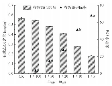 (图中小写字母不同表示不同处理间有效态Cd去除率存在差异显著(P < 0.05)) 图 4 MgAl-LDHs-C投加量对浙江台州渗育型水稻土中Cd的去除效果 Fig. 4 Effect of MgAl-LDHs-C dosage on removal of Cd in percogenic paddy soil from Taizhou City of Zhejiang Province |