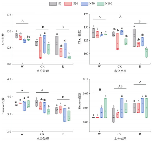 2 结果与分析 2.1 氮沉降、降水变化及相互作用对AM真菌群落的影响 2.1.1 AM真菌Alpha多样性的变化由图 1可知,AM真菌ACE指数在W(增雨)条件下显著高于CK(自然降雨)和R(减雨)条件下(P < 0.05),在W和R条件下AM真菌ACE指数和Chao1指数在施氮后均呈下降趋势。其中,在R条件下N100处理的ACE指数和Chao1指数均显著低于N0处理(P < 0.05);在CK条件下,N50处理的ACE指数和Chao1指数均高于N0处理,但差异不显著(P > 0.05)。Chao1指数和Shannon指数在R条件下显著低于W和CK条件下(P < 0.05)。在W条件下,AM真菌Shannon指数在施氮条件下呈现升高趋势,但无显著差异(P > 0.05);在CK和R条件下Shannon指数在施氮条件下均呈现下降趋势,其中CK条件下N100处理的Shannon指数显著低于N0处理(P < 0.05)。AM真菌Simpson指数在W条件下显著低于R条件下(P < 0.05),且在3种水分条件下的变化趋势一致,均随施氮水平的增加呈升高趋势,但差异不显著(P > 0.05)。