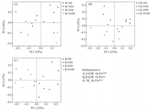 采用主坐标分析方法对各处理AM真菌在OTU水平上进行分析,评估AM真菌群落间的差异。由图 2A可以看出,PC1贡献率为23%,PC2贡献率为16%,在PC1横轴方向,W-N30(表示增雨条件下N30处理,以下类同)处理主要位于正半轴且与W-N0、W-N50和W-N100处理均存在较远距离。从图 2B可以看出,PC1和PC2对真菌群落结构变异的解释量分别为23% 和22%,CK-N30和CK-N50处理分布较为集中,与CK-N0和CK-N100处理距离较远。从图 2C可以看出,PC1和PC2对土壤AM真菌群落结构变异的解释量分别为23% 和17%,R-N30、R-N50和R-N100处理分布较为集中,R-N0处理与其他处理间距离较远,表明施肥后真菌群落结构发生了一定程度的改变。PERMANOVA分析表明,水分变化解释了18.3% 的真菌群落变化,相反氮素处理对真菌群落的影响较弱,仅解释了10.9% 的真菌群落变化,而水氮互作解释了38.3% 的真菌群落变化。