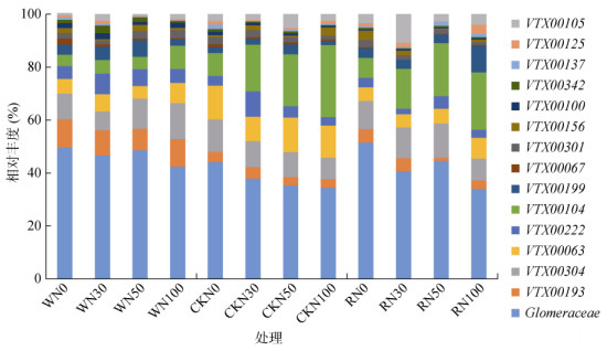 本研究高通量测序共获得1 335 939条有效序列,经对比,共得到165个OUT (操作分类单元),隶属于1个门1个纲4个目4个科4个属29个种。图 3显示,土壤AM真菌群落在种水平上物种组成相对丰度较高的群体分别为Glomeraceae(33.5% ~ 50.9%)、VTX00193(1.3% ~ 10.6%)、VTX00304(6.8% ~ 14.5%)、VTX00063(4.2% ~ 13.9%)、VTX00222(2.4% ~ 7.5%)和VTX00104(4.1% ~ 27.0%),占总丰度90% 以上。在W条件下,随着氮添加的逐渐增加,Glomeraceae和VTX00193相对丰度逐渐降低;VTX00304相对丰度呈现先降低后升高的趋势,在N30处理出现拐点;VTX00063和VTX00104相对丰度逐渐升高;VTX00222相对丰度则无显著变化。在CK条件下,随着氮添加水平升高,Glomeraceae和VTX00304相对丰度呈现降低趋势;VTX00193相对丰度则无显著变化;VTX00063相对丰度呈现先降低后升高的趋势,在N30处理出现拐点;VTX00222相对丰度呈现先升高后降低的趋势,在N30处理出现拐点;VTX00104相对丰度呈现升高趋势。在R条件下,随着氮添加量的逐渐增加Glomeraceae和VTX00193相对丰度呈降低趋势;VTX00304相对丰度呈现先升高后降低的趋势,在N50处理出现拐点;VTX00063和VTX00104相对丰度呈现升高趋势;VTX00222相对丰度呈现先降低后升高的趋势,在N50处理出现拐点。