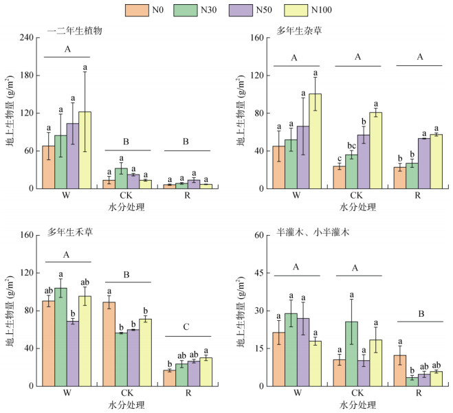 (不同大写字母表示不同水分处理之间差异显著(P < 0.05),不同小写字母表示同一水分处理下不同氮素处理之间差异显著(P < 0.05)) 图 4 不同处理对各生活型植物地上生物量的影响 Fig. 4 Aboveground biomass of various plants under different treatments |