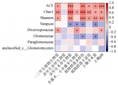 由图 5可以看出,ACE指数与一二年生植物生物量、植物群落丰富度和土壤含水量呈显著正相关,与多年生禾草生物量、植物群落多样性和土壤pH呈极显著正相关。Chao 1指数与半灌木、小半灌木生物量、土壤含水量和土壤pH呈显著正相关,与一二年生植物生物量、多年生禾草生物量、植物群落多样性和植物群落丰富度呈极显著正相关。Shannon指数与一二年生植物生物量和植物群落丰富度呈显著正相关,与多年生禾草生物量、植物群落多样性、土壤含水量和土壤pH呈极显著正相关。Simpson指数与多年生禾草、半灌木及小半灌木生物量、植物群落多样性和土壤含水量呈显著负相关。Diversisporaceae与一二年生植物、半灌木及小半灌木生物量和土壤pH呈显著正相关。Glomeraceae与植物群落多样性和土壤含水量呈显著负相关。