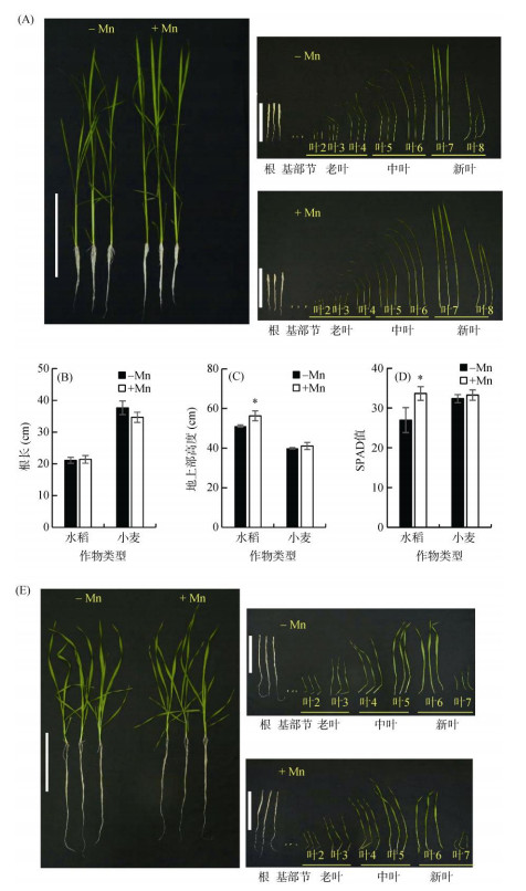 (A:水稻在加锰(+Mn)和缺锰(–Mn)条件下的生长情况;B:水稻和小麦根长;C:水稻和小麦地上部高度;D:水稻和小麦最新展开叶片的SPAD值;E:小麦在加锰和缺锰条件下的生长情况。图柱上方*号表示不同锰处理下植株间差异达P < 0.05显著水平,下同) 图 1 水稻和小麦对缺锰胁迫的耐性差异 Fig. 1 Differences of response to Mn deficiency stress between rice and wheat |