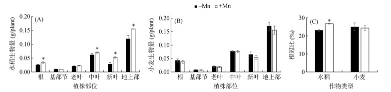 图 2 缺锰对水稻和小麦生物量和根冠比的影响 Fig. 2 Effects of Mn deficiency on biomass and root-to-shoot ratios of rice and wheat |