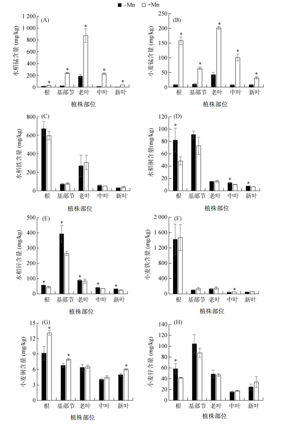 对水稻和小麦在加锰和缺锰条件下各部位铁、铜和锌含量进行分析,结果发现,与加锰处理相比,水稻在缺锰条件下的各部位铁含量无显著差异(图 3C),而铜在根、中叶和新叶中的含量显著升高(图 3D),锌含量在水稻的各部位均有所增加,其中在基部节中增加量最为显著(增加了48.3%)(图 3E)。而在小麦中,与加锰处理相比,缺锰处理的各部位铁含量均无显著差异(除中叶铁含量略有下降外)(图 3F),根、基部节和新叶中的铜含量显著降低(图 3G),根中的锌含量显著升高,而其他部位的锌含量无显著差异(图 3H)。