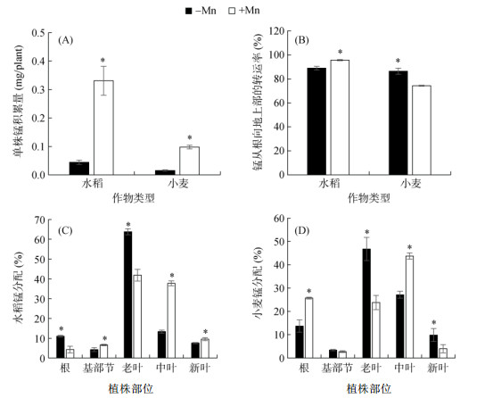 2.3 缺锰对水稻和小麦锰转运、分配和再分配的影响根据根和地上部的锰含量和生物量计算单株锰积累量,结果发现,与加锰处理相比,缺锰处理水稻和小麦的锰积累量分别降低了86.6% 和84.3%(图 4A)。不管是在加锰还是在缺锰条件下,小麦的锰积累量均比水稻的要低(图 4A)。但与加锰处理相比,缺锰处理小麦和水稻中锰从根向地上部的转运率分别增加和降低了16.4% 和7.5%(图 4B)。表明缺锰时,与水稻相比,小麦可将更多的锰从根中转运到地上部。同时分析不同部位锰的分配发现,缺锰时增加了锰向水稻根和老叶的分配,减少了基部节、中叶和新叶中锰的积累(图 4C);而缺锰降低了锰向小麦根和中叶的分配,增加了锰在老叶和新叶的积累(图 4D)。表明缺锰时,小麦从根中运输到地上部的锰,主要是运往老叶和新叶中。