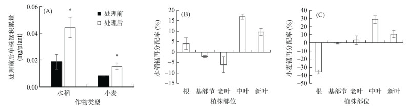 图 5 水稻和小麦中锰的再分配 Fig. 5 Redistribution ratios of Mn in rice and wheat |