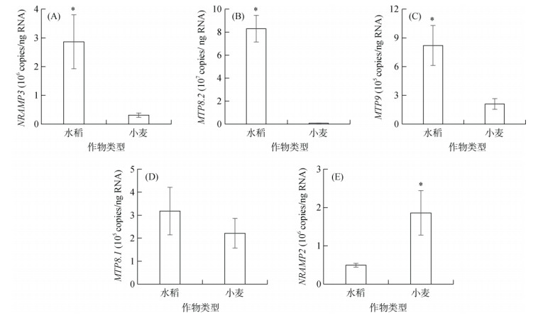 绝对实时荧光定量PCR结果发现,转运基因NRAMP3、MTP8.2和MTP9在水稻根中的拷贝数是小麦的9.1倍、103.1倍和3.9倍(图 6A、图 6B和图 6C)。MTP8.1在水稻和小麦中的拷贝数则无显著差异(图 6D)。小麦根中TaNRAMP2的拷贝数是水稻OsNRAMP2的3.8倍~ 5.1倍(图 6E),表明NRAMP3、MTP8.2和MTP9在水稻根中的表达量比小麦高,而小麦中TaNRAMP2的表达量比水稻OsNRAMP2更高。