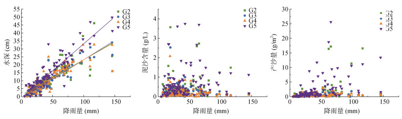 图 1 径流量(水深)、泥沙含量及产沙量随降雨量变化 Fig. 1 Variation of runoff (water depth), sediment charge and sediment yield with rainfall |