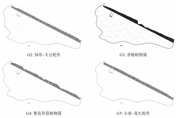 试验用径流场建于2002年,共设5个处理:多年生牧草,G1;旱作饲草与大豆轮作,G2;香椿植物蓠,G3;紫花苜蓿植物蓠,G4;小麦–花生轮作,G5。其中,处理G1为多年生黑麦草种植,具有很好的水土保持效果,但是由于连作障碍,小区中途废弃,故现存4个处理小区。试验中篱笆植物的筛选通常考虑符合3个特点:①植物篱容易建立与维护,植物生物量高;②可促进土壤养分循环,改善土壤肥力;③具有一定经济价值,如可作为饲料、柴火、绿肥等多种用途[6]。本试验以当地普遍采用的小麦–花生顺坡耕作(G5)为对照;G3、G4处理分别以香椿和紫花苜蓿作为篱笆植物,沿等高线按行距20 cm,两行之间植株“品”字型交错布设,套作于小麦–花生坡耕地;G2处理以黑麦草为优质饲草,选择秋冬季浅耕、撒播,翌年5月份清地后点播大豆(或籽粒苋),实行免少耕,减少耕翻引起的土壤流失。各小区年施肥量均为N 0.9、P2O5 0.59、K2O 0.63 kg/plot。