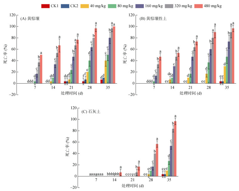 2 结果与分析 2.1 莠去津对蚯蚓死亡率的影响由图 1可知,3种土壤中各莠去津暴露浓度组蚯蚓的死亡率随着时间的延长而上升,且暴露浓度越高,蚯蚓的死亡率越高。暴露7 d时,黄棕壤和黄棕壤性土中,160、320、480 mg/kg三个浓度组蚯蚓的死亡率与对照组相比,具有显著差异,而前三者间也存在显著差异,说明在这两种土壤中短期高浓度(160、320、480 mg/kg)莠去津暴露对蚯蚓的致死效应较强。暴露14 d时,黄棕壤性土中80 mg/kg浓度组蚯蚓的死亡率与对照组相比,出现显著差异(P < 0.05);石灰土中各浓度组中均逐渐出现蚯蚓死亡的现象。暴露21 d时,黄棕壤中80 mg/kg浓度组蚯蚓死亡率与对照组相比,也出现显著差异(P < 0.05)。暴露28和35 d时,黄棕壤和黄棕壤性土中各浓度组蚯蚓死亡率与对照组相比,均存在显著差异(P < 0.05);石灰土中,除40 mg/kg浓度组外,各浓度组与对照组相比,也均存在显著差异(P < 0.05)。