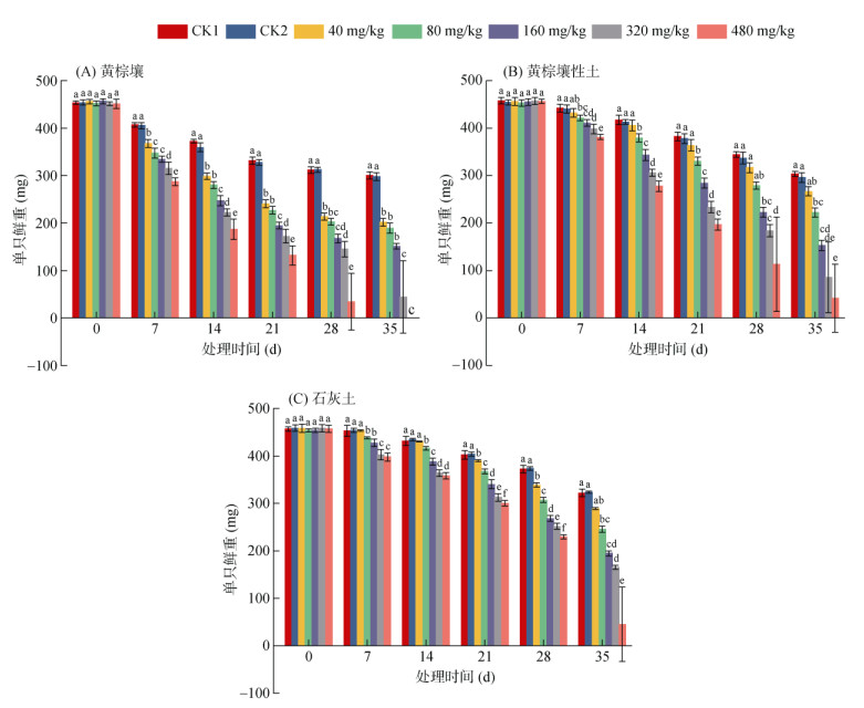 由图 2可知,3种土壤中除40 mg/kg浓度组外,其他各浓度组蚯蚓鲜重随着时间的延长均出现了显著的下降,且浓度越高,鲜重降低越多。