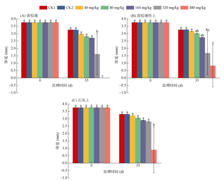 由图 3可知,3种土壤中莠去津对蚯蚓体宽的抑制作用均随浓度的增加而增加。暴露35 d时,黄棕壤和黄棕壤性土中,高浓度组(320、480 mg/kg)蚯蚓体宽与对照组相比,存在显著差异(P < 0.05);石灰土中,仅480 mg/kg浓度组蚯蚓体宽与对照组存在显著差异(P < 0.05)。该结果表明高浓度的莠去津暴露对蚯蚓体宽存在明显的抑制作用。