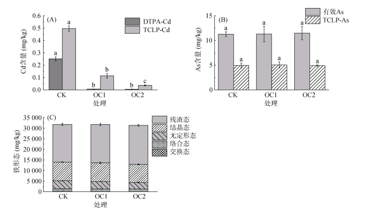 (图中不同小写字母表示处理间差异显著(P < 0.05)) 图 1 不同处理下Cd(A)和As(B)的有效态含量变化及铁形态差异(C) Fig. 1 Concentrations of available Cd (A) and As (B) and iron fractions (C) under different treatments |