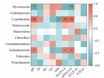 2.3.3 环境因子与微生物群落结构的相关性为了进一步明确环境因子与土壤微生物群落的关系,对门水平的主要细菌与土壤理化因子进行Pearson相关性分析(图 3),结果显示,pH和Cd的有效性是影响微生物群落的重要因素。与大数研究相同,本研究中pH为影响微生物的显著因素,这是由于pH能引起土壤重金属有效性、有机质腐殖化和土壤酶活性等的变化[32]。同时,pH是微生物生长的限制因素,如本研究中的蓝藻细菌门更偏好碱性环境,巯基坡缕石的添加降低了土壤pH,使蓝藻生长环境恶化,相对丰度降低,与Rangsayatorn等[31]的研究一致。本研究中的蓝藻细菌门与放线菌门丰度和Cd的有效性呈显著负相关,这是由于其通过特殊的代谢能力减少重金属对自身的毒性[27]。此外,添加巯基坡缕石后,Cd的有效性降低,Cd对粘球菌门(Myxococcota)的毒性降低,因此粘球菌门丰度升高。然而,有机质对微生物群落的影响并没有产生显著影响,与前人研究不一致。这可能是由于巯基坡缕石引起的pH与Cd的有效性变化对微生物群落影响强于有机质的影响,这说明巯基坡缕石通过显著改变土壤pH与Cd的有效性对微生物群落产生影响。