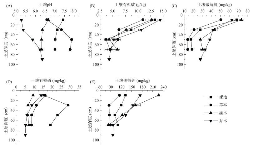 2 结果与分析 2.1 植被类型对紫色土化学性质的影响研究区裸地、草本、乔木和灌木覆盖下的紫色土pH分别为7.0 ~ 7.5、6.5 ~ 8.0、5.25 ~ 6.5和6.3 ~ 6.6。随着土层深度的增加,裸地和灌木覆盖土壤pH呈下降趋势,而草地和乔木覆盖土壤pH则呈相反趋势(如图 1A)。在同一土层深度下,土壤pH因植被覆盖差异而不同。其中,在0 ~ 20 cm土层,不同植被覆盖下土壤pH表现为裸地 > 灌木 > 草本 > 乔木,与裸地相比,灌木、草本与乔木覆盖下分别降低了10.24%、11.19%、28.98%;在 > 20 cm土层,不同植被覆盖下土壤pH表现为草本 > 裸地 > 灌木 > 乔木,与裸地相比,草本覆盖下增加了3.04%(20 ~ 40 cm土层)、12.06%(40 ~ 60 cm土层)、11.23%(60 ~ 80 cm土层),灌木与乔木覆盖下分别降低了10.71%、24.56%(20 ~ 40 cm土层),10.06%、16.5%(40 ~ 60 cm土层),9.70%、10.99%(60 ~ 80 cm土层)。