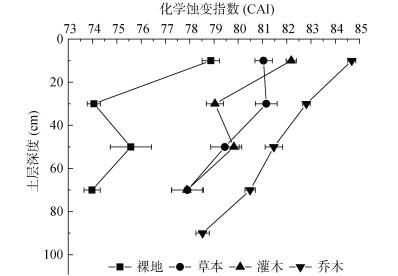2.2 植被类型对紫色土风化程度的影响乔木、灌木、草本和裸地覆盖下紫色土化学蚀变指数分别为78.53 ~ 84.68、77.89 ~ 82.18、77.91 ~ 81.04、73.98 ~ 78.87。乔木覆盖下CAI值随土层深度的增加而降低,且同一土层深度下,乔木覆盖下土壤CAI值皆高于其他植被覆盖;草本覆盖下CAI值随土层深度增加呈先增加后降低的趋势,最大值出现在20 ~ 40 cm土层;灌木与裸地覆盖下CAI值随土层深度的增加呈先降低后增加的趋势,最大值出现在0 ~ 20 cm土层。在0 ~ 20 cm与40 ~ 60 cm土层,不同植被覆盖的紫色土CAI值表现为乔木 > 灌木 > 草本 > 裸地,相比于裸地,乔木、灌木和草本覆盖下分别增加了7.37%、4.20%、2.76%(0 ~ 20 cm土层),7.80%、5.62%、3.13%(40 ~ 60 cm土层);在20 ~ 40 cm土层,不同植被覆盖的紫色土CAI值表现为乔木 > 草本 > 灌木 > 裸地,相比于裸地,乔木、草本与灌木覆盖下分别增加了11.83%、9.59%、6.74%;在60 ~ 80 cm土层,不同植被覆盖下的紫色土CAI值表现为乔木 > 草本 > 灌木 > 裸地,相比于裸地,乔木、草本和灌木覆盖下分别增加了8.80%、5.31%、5.28%。