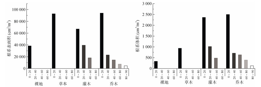 4 结论1) 4类植被覆盖类型的根系在紫色土中主要分布在0 ~ 20 cm土层,均呈现随土层深度的增加而减少的趋势,根系表面积与体积也随之降低。乔木根系分布至90 cm深度,灌木根系分布至60 cm深度,草本与裸地覆盖下的根系仅存在于0 ~ 20 cm土层。