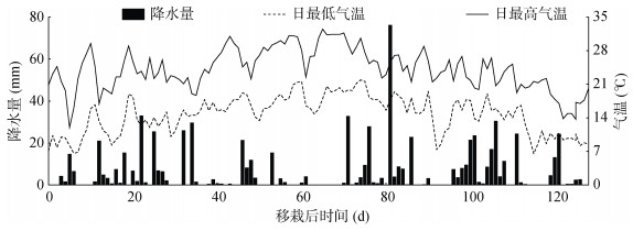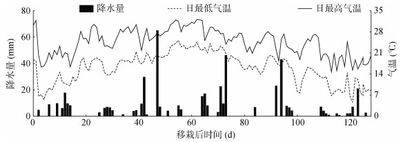 图 2 2021年水稻生长期气温和降水量日变化 Fig. 2 Daily variation of air temperature and precipitation during rice growing season in 2021 |