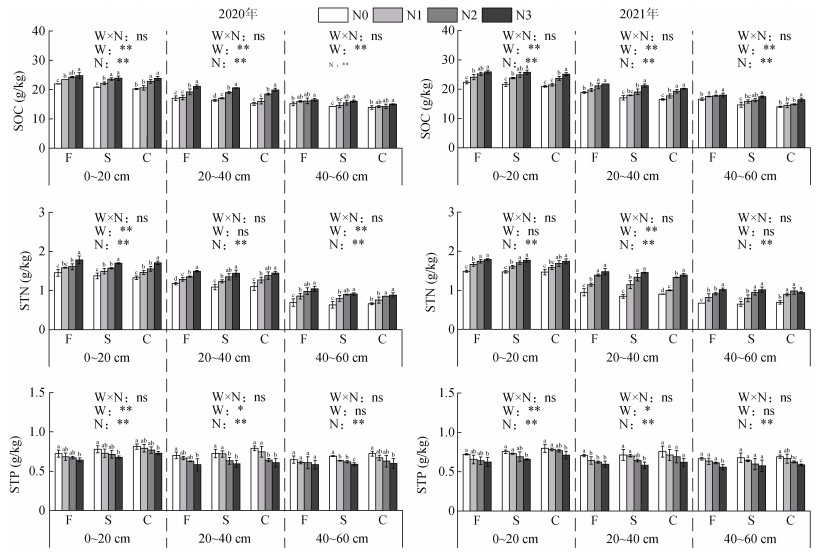 定位试验开始于2017年,在2020年和2021年水稻收获后采集0 ~ 20、20 ~ 40、40 ~ 60 cm土层土壤样品。每个试验小区同一土层土壤样品用五点法取样,样品混合均匀后装入自封袋备用,共收集36个土壤样品。采样后去除可见砾石、植物残留物等,并将土壤置于阴凉处风干,研磨,通过100目网筛后装入自封袋保存。土壤全氮(STN)用H2SO4–混合催化剂(硫酸钾–硫酸铜–硒)法消解,土壤全磷(STP)用H2SO4-HClO4法消解,消解液过滤后,装入50 mL塑料瓶中待测。STN和STP采用连续流动分析仪(AutoAnalyzer-3型,德国Bran+Luebbe公司)测定。土壤有机碳(SOC)用总有机碳分析仪(Elementar vario TOC,德国)测定。