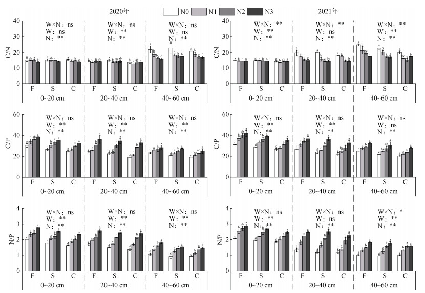 不同水氮管理模式土壤碳氮磷化学计量比如图 4所示。土壤C/N与土层深度呈正相关,与施氮量呈负相关,土壤C/P、N/P与土层深度呈负相关,与施氮量呈正相关。2020年土壤C/N、C/P、N/P分别介于12.60 ~ 22.61、19.14 ~ 38.57、0.91 ~ 2.77,2021年分别为13.57 ~ 24.71、20.25 ~ 41.73、0.96 ~ 2.88,仅从土壤碳氮磷化学计量比变化范围看,年际间差异较小。3种灌溉模式下,各土层C/N较N0处理降低0.55% ~ 28.29%,C/P、N/P较N0处理增加4.38% ~ 59.20%、11.63% ~ 83.90%,各土层平均C/N随施氮量增加而降低,C/P、N/P随施氮量增加而减小。总体上,控制灌溉模式下土壤C/N、C/P、N/P低于其余两种灌溉模式,常规淹灌模式各土层平均C/N、C/P、N/P比浅湿灌溉模式提高0.97%、9.49%、8.55%,比控制灌溉模式提高5.36%、20.75%、14.66%。
