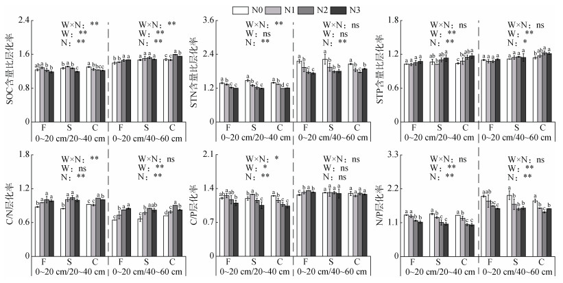 4) 施氮能提升不同土层平均C/N层化率,降低C/P、N/P层化率;相比常规淹灌模式,控制灌溉模式能提升不同土层SOC、STP含量层化率,在一定程度上说明控制灌溉模式下配施适宜氮肥可以改善土壤质量。