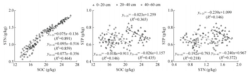 图 6 土壤碳氮磷含量间相关关系 Fig. 6 Correlations between contents of soil carbon, nitrogen and phosphorus |