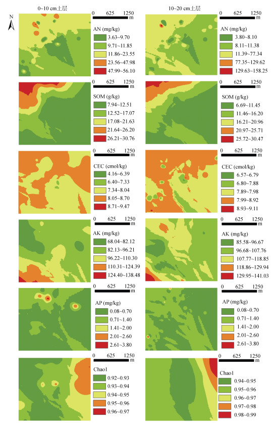 2.2 各项肥力指标的空间结构 2.2.1 肥力指标的半方差函数本研究通过决定系数和残差平方和来确定最适半方差函数模型(表 7)。其中,速效磷符合球状模型,速效钾和表层CEC符合线形模型,深层Chao1符合指数模型,其他指标则最适合高斯模型。块金系数(C0/(C+C0))为块金值与基台值的比值,其表示随机因素引起的空间变异占总变异的比例[35]。研究区碱解氮、有机质、CEC及深层速效磷的块金系数均小于25%,在空间上呈现强空间自相关性,表明其变异主要受结构性因素(气候、地形和母质等)的影响。深层速效钾块金系数大于75%,在空间上呈现弱空间自相关性,说明随机性因素在其空间变异中占主导地位。变程反映了变量空间自相关性的最大距离[36]。研究区有机质、速效钾、Chao1指数及表层CEC变程较大,均大于1 000 m,深层有机质变程达4 226 m,为区内最大,表明环境因素在较大范围内影响其空间变异性。碱解氮、速效磷和深层CEC变程较小,在104 ~ 248 m范围内,结合块金系数可以看出,其在小范围内具有最显著的空间变异性,空间分布特征也最为复杂。由于各土壤肥力指标的变程均大于取样间距,进一步研究时可以适当地增大采样面积而减少采样点数[37]。