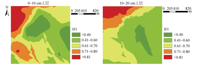 对研究区50个样点的IFI值分两层进行描述性统计分析(表 8),结果表明,样点的IFI值服从正态分布,变异系数为38%,属于中等强度变异。其中,表层土壤的IFI平均值为0.55,偏度为负值,其分布峰为左偏;深层土壤的IFI平均值为0.53,偏度为正,其分布峰为右偏。偏度代表着指标在分布上的不对称性,表明表层土壤的大多数IFI值大于其平均值,而深层土壤的大多数IFI值小于其平均值。