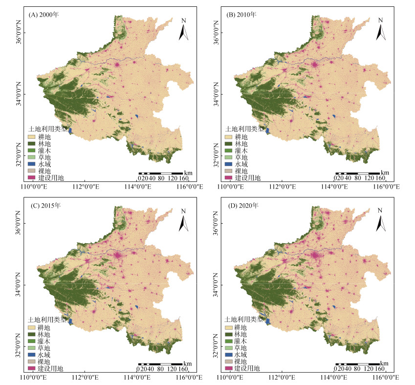 图 2 2000—2020年河南省土地利用空间分布图 |