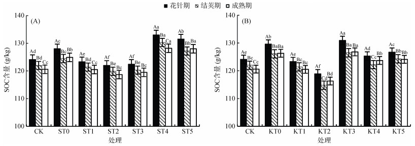 2 结果与分析 2.1 不同处理下土壤有机碳的含量特征SOC是土壤固相的重要组成部分,由植物和动物组织及处于不同分解阶段的土壤微生物体组成,是表征土壤类型的主要特征之一[18]。由图 1可知,各处理SOC含量在花生不同生育期各不相同。各生育期SOC含量表现为:化肥减量配施生化和矿源黄腐酸钾各处理花针期显著高于结荚期和成熟期,各处理SOC含量表现为:ST4 > ST5 > ST0 > CK > ST1 > ST3 > ST2,KT3 > KT0 > KT5 > KT4 > CK > KT1 > KT2,其中化肥减量配施生化黄腐酸钾中ST4处理各生育期SOC含量均最高,花针期、结荚期、成熟期分别为133.0、130.3、128.2 g/kg;化肥减量配施矿源黄腐酸钾中KT3处理各生育期SOC含量均最高,花针期、结荚期、成熟期分别为130.9、126.5、126.8 g/kg。