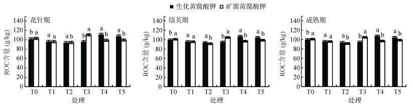 由图 10可知,T4和T5处理在各生育期内均表现为配施生化黄腐酸钾处理ROC含量高于配施矿源黄腐酸钾处理,花针期、结荚期、成熟期分别高12.0、7.8 g/kg,10.2、5.6 g/kg,7.6、3.1 g/kg,且ST4处理SOC含量高于KT3处理。综上,化肥减量配施不同有机肥在不同生育期对ROC含量有一定影响,其中以25% 化肥配施75% 生化黄腐酸钾效果最佳。