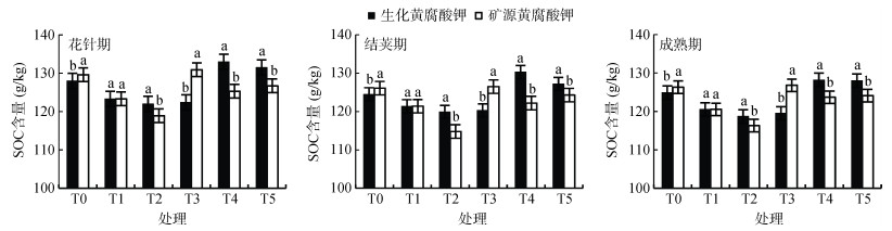 由图 2可知,T2、T4和T5处理在各生育期内均表现为配施生化黄腐酸钾处理SOC含量显著高于配施矿源黄腐酸钾处理,花针期分别高2.60%、4.44%、2.06%,结荚期分别高6.14%、6.62%、3.63% 和成熟期分别高3.78%、2.33%、3.14%,且ST4处理SOC含量高于KT3处理。由此可见,25% 化肥配施75% 生化黄腐酸钾处理效果最佳。