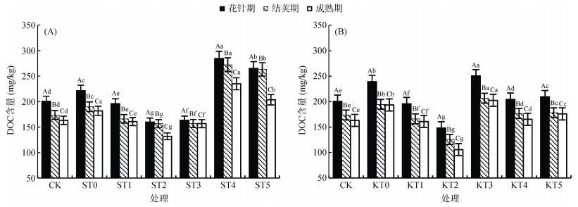 DOC是土壤碳库中流动性和活性最强的碳组分,对温度变化具有较高的敏感性。DOC对增温的响应将深刻影响土壤养分周转,进而影响土壤生态系统碳循环[19]。从图 3得知,各处理DOC含量不同生育期表现为:花针期 > 结荚期 > 成熟期,各生育期间差异显著(P < 0.05)。与CK处理相比,花针期ST0、ST4、ST5、KT0、KT3、KT4、KT5处理DOC含量增加2.00% ~ 41.85%;结荚期相应处理DOC含量增加1.84% ~ 56.76%;成熟期相应处理增加1.29% ~ 43.91%。