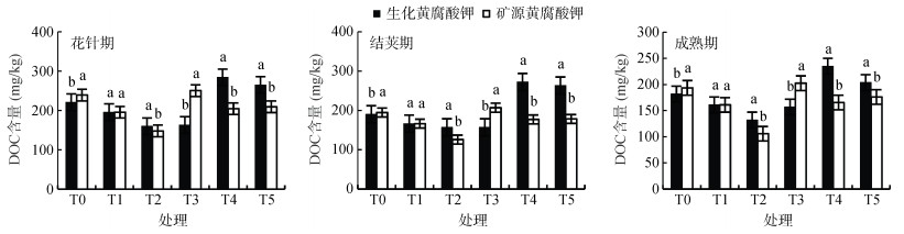 从图 4可知,T2、T4、T5处理DOC含量各个生育期内均为配施生化黄腐酸钾处理高于配施矿源黄腐酸钾处理(P < 0.05),花针期、结荚期、成熟期分别高出7.90%、39.07%、26.54%,31.90%、53.93%、47.70% 和24.67%、42.08%、15.68%。综上,各生育期化肥配施不同有机肥对DOC含量均有一定的影响,其中以25% 化肥配施75% 生化黄腐酸钾效果最佳。