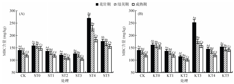 MBC是SOC中最活跃的部分,直接影响SOC的转化过程和土壤理化性状,能够准确反映土壤质量的变化[20]。如图 5所示,化肥减量配施生化和矿源黄腐酸钾各处理MBC含量不同生育期均表现为:花针期 > 结荚期 > 成熟期,各生育期间差异显著(P < 0.05)。各处理MBC含量表现为:ST4 > ST5 > ST0 > CK > ST1 > ST3 > ST2,KT3 > KT0 > KT5 > KT4 > CK > KT1 > KT2,其中ST4和KT3处理花针期、结荚期、成熟期MBC含量分别为269.7、229.6、183.1 mg/kg和251.7、175.9、158.7 mg/kg。