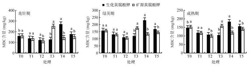 图 5 不同生育期各处理MBC含量特征 Fig. 5 MBC contents at different growth stages under different treatments |