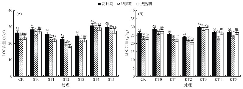 LOC是在土壤酶和微生物作用下易被分解的有机碳,能表征SOC的稳定性[21]。由图 7可知,不同生育期化肥减量配施有机肥各处理对LOC含量有影响。各生育期不同处理下LOC含量均表现为:ST4 > ST5 > ST0 > CK > ST1 > ST3 > ST2,KT3 > KT0 > KT5 > KT4 > CK > KT1 > KT2,其中化肥减量配施生化黄腐酸钾中ST4处理各生育期LOC含量均最高,花针期、结荚期、成熟期分别为30.76、29.59、29.49 g/kg,与CK处理相比分别增加了16.65%、26.08%、25.76%,与单施化肥处理(ST1)相比分别增加了19.83%、31.34%、32.90%;而化肥减量配施矿源黄腐酸钾中KT3处理各生育期LOC含量均最高,花针期、结荚期、成熟期分别为29.87、28.85和28.64 g/kg,与CK处理相比分别增加了13.27%、22.92%、22.13%,与单施化肥处理(KT1)相比分别增加了16.36%、28.05%、29.07%。