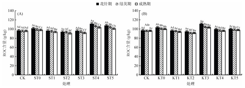 ROC相较于活性有机碳,稳定性更高、更难分解,在维持土壤质量及健康等方面具有重要作用[22]。由图 9可知,化肥减量配施生化黄腐酸钾各处理与CK处理相比,花针期ROC含量在ST0、ST4、ST5处理下增加4.76% ~ 14.99%,在ST1、ST2、ST3处理下减少0.62% ~ 3.21%;结荚期ROC含量在ST0、ST4、ST5处理下分别增加3.33%、11.24%、8.53%,在ST2、ST3处理下分别减少2.60%、1.66%;成熟期ROC含量在ST0、ST4、ST5处理下分别增加2.19%、7.91%、5.00%,在ST1、ST2、ST3处理下分别减少2.39%、5.52%、4.58%。化肥减量配施矿源黄腐酸钾各处理与CK处理比较,花针期ROC含量在KT0、KT3、KT4、KT5处理下增加2.59% ~ 14.58%,在KT1、KT2处理下分别减少0.52%、4.99%;结荚期在KT0、KT3、KT4、KT5处理下增加0.62% ~ 8.95%,KT2处理下减少4.89%;成熟期在KT0、KT3、KT4、KT5处理下增加0% ~ 7.49%,在KT1、KT2处理下分别减少2.39%、4.99%。