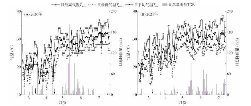 2020年和2021年冬瓜种植季的降雨量和气温变化如图 1所示。2020年冬瓜生长期间最高气温37.5 ℃,最低气温13.5 ℃,平均气温22.1 ℃,总降雨量是1 126.6 mm,主要集中在5—6月;2021年冬瓜生长期间最高气温37.8 ℃,最低气温14.8 ℃,平均气温26.2 ℃,总降雨量是791.9 mm,主要集中在6—7月。